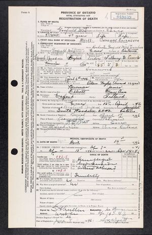 • [2] Province of Ontario Registration of Death, Form 6. Registration No. 018139. County of Essex, Division of Gosfield North. "Catherine Elizabeth Myles". April 15, 1946.
