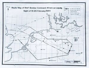 Finally 5 pm came and Tom Smith and Bernard Downs settled down behind closed doors for the briefing. The sheet was removed revealing a large map with a red tape running across to the target. The black board contained a series of tracks and times. At the head of the board in large capitals was written LEIPZIG 19/2/44. All the aircraft would carry a similar bomb loading cosisting of one 2,000-lb high explosive and 8,000 lb in canisters of incendiaries.