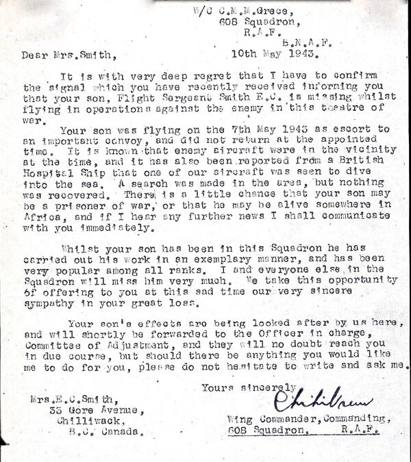 The commander of the four boys who died, Clair Mansell Maybury Grece [5], Wing Commander, Commanding, 608 Squadron, R.A.F., sent letters to the boys' mothers. One letter which survives is to the pilot Everett Smith's mother. It contains details of the circumstances of their death.